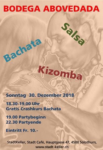 Im schönsten Keller Solothurns feiern wir unsere 2. Party. Wir freuen uns Euch wieder begrüssen zu dürfen, bevor sich das Jahr 2018 endgültig verabschiedet. Feiert mit uns und lasst Euch bezaubern vom aussergewöhnlichen Ambiente des StadtKellers. Diesmal wird uns Dj Segundo mit seiner Musik begleiten. 18.30 - 19.00 Uhr Gratis Bachata Crashkurs. ab 19.00 Uhr Partybeginn und wir feiern bis 22.30 Uhr https://www.stadt-keller.ch/