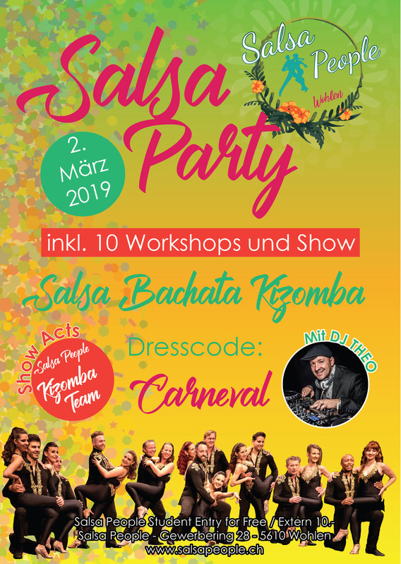 Am Samstag 02.03.2019 im Gewerbering 28 in 5610 Wohlen ab 18.00 Uhr finden in der neuen Location von Salsa People Aargau, Workshops mit anschliessender Party (inkl. 1 Showacts) statt. An der Party wird Dj Theo heisse Musik auflegen!! Verbringe mit uns einen einzigartigen Abend mit viel Spass Musik und Tanz =) Wir freuen uns auf euch!!!! 18.00-18.45 Kizomba Beginner - Class (Cuba Raum) 18.00-18.45 Kizomba Open - Class (Puerto Raum) 18.50 -19.35 Bachata Beginners (Cuba Raum) 18.50 -19.35 Bachata Open (Puerto Raum) 19.40 -20.25 Salsa Basic (Cuba Raum) 19.40 -20.25 Salsa Open Cubana (Puerto Raum) 20.30 - 21.15 Salsa Open Puertoriqueña (Puerto Raum) 20.30 - 21.15 Salsa Beginners (Cuba Raum) 21:20 - 21:50 Rueda Beginners (Cuba Raum) 21:20 - 21:50 Rueda Open (Puerto Raum) www.salsapeople.ch