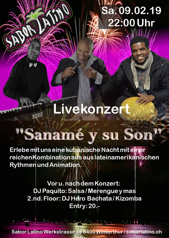 Erlebe mit uns eine kubanische Nacht mit einer reichen Kombination aus Lateinamerikanischen Rhythmen präsentiert von "Saname y su Son". Vor und nach dem Konzert darf natürlich getanzt werden zu bester Musik von DJ Manuel und DJ Hero. DJ Paquito: Salsa, Bachata y mas DJ Hero: Kizomba Entry: 20.- Für jene die mit dem Auto anreisen gibt es Gratisparkplätze vor dem Club. Mit den ÖV ist das Sabor Latino gut erreichbar. Für die Rückreise zum HB organisieren wir auf Wunsch ein Sammeltaxi. www.saborlatino.ch www.saborlatino.ch