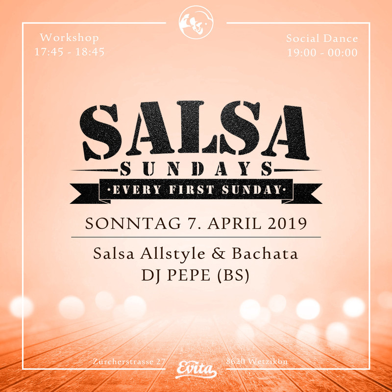 SALSA SUNDAYS - April 1st Edition Am Sonntag 7. April 2019 ist SALSA SUNDAYS - April 1st Edition angesagt. VORMERKEN: Weils so schΓΆn ist, findet diesen Monat zusΓ€tzlich die grosse EASTER SPECIAL EDITION am Ostersonntag 21. April 2019 statt. π₯Und du kannst am Sonntag 7. April einen Fullpass und ein Partyticket dafΓΌr gewinnen!π₯ Das grosse EASTER SPECIAL mit mehreren Workshops von nationalen und internationalen Teachern, fantastischem Sound von DJ GALANTE und DJ MONTUNO, und noch mehr Party und Tanzstunden! πππ Infos hier auf salsa.ch unter Salsa Sundays - Easter Special Sonntag 21. April 2019! Infos zum 7. April: πΈπΆ PREISE πΆπΈ Eintritt: 12.- Workshop (inkl. Party): 35.-* *Workshopdauer lΓ€nger als sonst! πΈπΆ PROGRAMM πΆπΈ Workshop Time: 17:30- 18:45 Social Dancing: 19:00 - 00:00 πΈπΆ WORKSHOP INFOS πΆπΈ Sonntag 7. April 2019 Art: MUSICALITY Teacher: Alexis Hernandez Beschrieb: Du lernst in intensiven 75 Minuten, wie du Musik interpretieren und wie du auf verschiedene Elemente tΓ€nzerisch reagieren kannst. Mit den wertvollen Inputs gehst du wieder einen Schritt in die Richtung die Musik und das Tanzen nich mehr geniessen zu kΓΆnnen! πΈπΆ MUSIC πΆπΈ Salsa Allstyles und Bachata by Dj Pepe (BS) πΈπΆ DATEN 2019πΆπΈ 6. Januar 2019 3. Februar 2019 3. MΓ€rz 2019 7. April 2019 21. April 2019 --> ACHTUNG - THE BIG SPECIAL EDITION! EARLY BIRD TICKETS jetzt auf eventfrog.ch bestellen! Nur noch bis 21. MΓ€rz 2019! 5. Mai 2019 2. Juni 2019 7. Juli 2019 Salsa Sundays Summer Season Closing August - Sommerpause 1. September 2019 BIG NEW SEASEON START 6. Oktober 2019 3. November 2019 1. Dezember 2019 EASTER SPECIAL am Ostersonntag 21. April 2019 (Ausnahmsweise eine zusΓ€tzlich SALSA SUNDAYS am 3. Sonntag im Monat)
