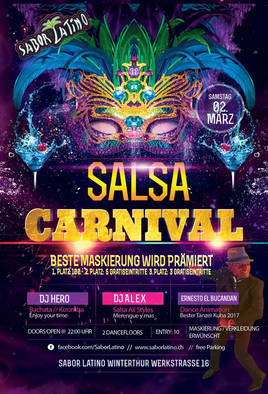Mach mit an Salsa Fasnacht und sei Teil dieser speziellen Party. Wenn Du maskiert kommst, dann kannst Du tolle Preise gewinnen. Es wird ein Geheimnis sein, mit wem Du tanzt und vielleicht wird der Schleier ja gelüftet. 2 Dancefloors :: Show mit Ernesto el Bucandan Mainfloor Salsa All Styles; Bachata; Merengue y mas: DJ Alex Sensualfloor Kizomba / Bachata: DJ Hero Show by Ernesto el Bucandan (ausgezeichnet in Cuba als bester Tänzer 2017) Prämierung für die Beste Maskerade oder Verkleidung: 1. Preis: 100.- Chf 2. Preis: 5 Gratiseintritte 3. Preis 3 Gratiseintr. Entry: 10.- Doors open: 22:00 Uhr www.saborlatino.ch