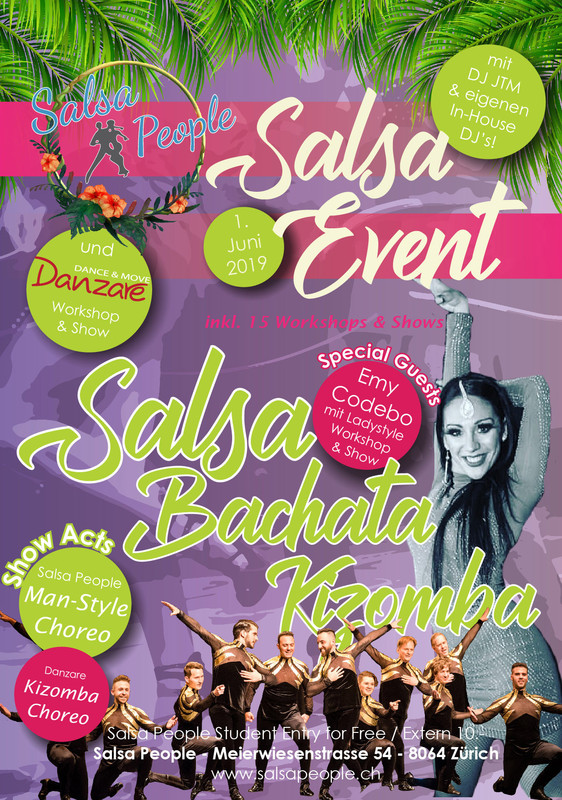 01.06.19 Gratis Workshops & Party by Salsa People Am Samstag 01.06.19 ab 18.00 Uhr offerieren wir 15 Workshops & Show Acts mit anschliessender Party. Show Acts: Kizomba Show - Danzare Student Salsa Show - Manstyle Student Team Salsa Show - Emy Codebo (Special Guest) 18.00 - 18.45 Salsa Cubana Int F&S (White Room) 18.00 - 18.45 Salsa Cubana Beg T&D (Orange Room) 18.00 - 18.45 Bachata Basic P&M (Green Room) 18.45 - 19.30 Bachata Int T&V (White Room) 18.45 - 19.30 Kizomba Beg K&S (Orange Room) 18.45 - 19.30 Salsa Basic M&L (Green Room) 19.30 - 20.15 Bachata Int Danzare (White Room) 19.30 - 20.15 Salsa Linie Beg K&A (Orange Room) 19.30 - 20.15 Kizomba Int F&S (Green Room) 20.15 - 21.00 Salsa Line Int T&V (White Room) 20.15 - 21.00 Bachata Beg M&M (Orange Room) 20.15 - 21.00 Salsa Basic M&L (Green Room) 21.00 - 21.45 LadyStyle ab Beg Emy Codebo (White Room) 21.00 - 21.45 ManStyle ab Beg Mauro (Orange Room) 21.00 - 21.45 Cha Cha Chà Basic M&L (Green Room) DJ's: DJ Dos / Bachata Floor im White Room DJ Sin Nombre / Salsa Floor im Orange Room DJ Jtm / Kizomba Floor Green Room Verbringe mit uns einen einzigartigen Abend mit viel Spass, Musik und Tanz =) Für externe mit Party Ticket 10.- ( 3 Floors; Salsa | Bachata | Kizomba) Wir freuen uns auf euch!!!! Keine Anmeldung nötig! www.salsapeople.ch/events
