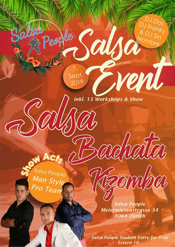 Am Samstag 07.09.19 ab 18.00 Uhr offerieren wir 15 Workshops & Show Acts mit anschliessender Party. Show Acts: Salsa Show - Man Style Pro Team Workshop Plan: 18:00 - 18:45 Salsa Cubana Int (White Room) 18:00 - 18:45 Kizomba Beg (Orange Room) 18:00 - 18:45 Bachata Basic (Green Room) 18:45 - 19:30 Bachata Adv (White Room) 18:45 - 19:30 Kizomba Int (Orange Room) 18:45 - 19:30 Salsa Basic (Green Room) 19:30 - 20:15 Salsa Linie Int (White Room) 19:30 - 20:15 Bachata Beg (Orange Room) 19:30 - 20:15 Kizomba Basic (Green Room) 20:15 - 21:00 LadyStyle ab Beginners (White Room) 20:15 - 21:00 ManStyle ab Beginners (Orange Room) 20:15 - 21:00 Cha Cha Chà Basic (Green Room) 21:00 - 21:45 Salsa Rueda ab Beginners (White Room) 21:00 - 21:45 Salsa Rueda Basic (Orange Room) 21:00 - 21:45 Bachata Int (Green Room) DJ's: DJ Sin Nombre / Salsa Floor im White Room DJ Dos / Bachata Floor im Orange Room DJ Franky/ Kizomba Floor Green Room Verbringe mit uns einen einzigartigen Abend mit viel Spass Musik und Tanz =) Für externe mit Party Ticket 10.- ( 3 Floors; Salsa | Bachata | Kizomba) Wir freuen uns auf euch!!!! *Keine Anmeldung nötig! https://www.salsapeople.ch/events