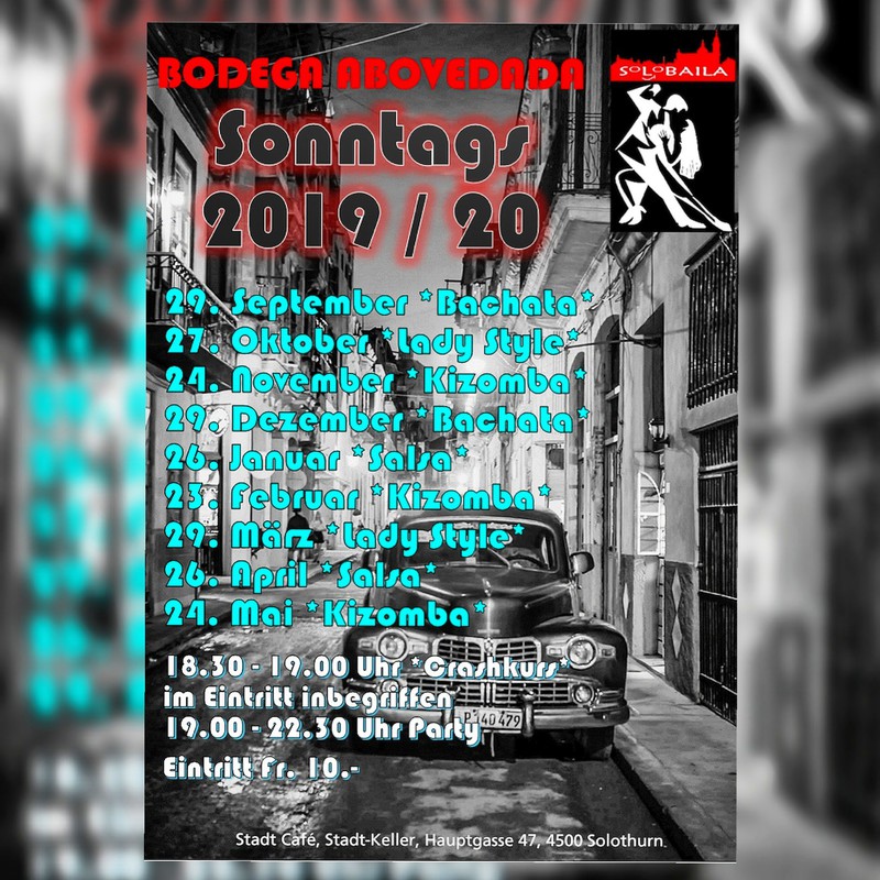 Geniesst mit uns den Sonntag Abend zu guter Musik von Dj Salsero. Diesmal offerieren wir Euch einen Salsa-Crashkurs. 18.30-19.00 Uhr. Party beginnt ab 19.00 Uhr. Wir freuen uns auf Euch.