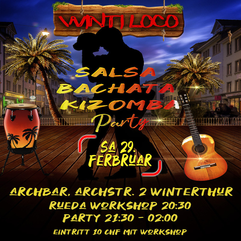 Das isi DIE Salsa, Bachata und Kizomba Party in Winterthur. Erlebe ein tolles Ambiente und coole Leute. Location: Tanzsaal Archbar, Archstr. 2 Winterthur One Floor : 40% Salsa, 30% Bachata , 30% Kizomba Rueda Workshop 20:30 - 21:30 danach Party bis 02:00 Eintritt 10 CHF Wir freuen uns auf dich !