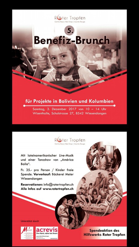 Para Projectos en Bolivia y Colombia www.rotertropfen.ch Disfruta de un exquisito desyuno (Brunch) acompañado de ritmos latinoamericanos en vivo y la participacion de America Baila. todo lo recaudado ira para los projectos en Bolivia y Colombia . Actividad gracias a la valiosa ayuda por 5ta. vez de Bäckerei Meier en Wiesendangen Entrada Adultos: 35.00 CH Niños: Libre spende Preventa: Bäckerei Meier Wiesendangen Reservaciones: info@rotertropfen.ch Für projekte in Bolivien und Kolumbien www.rotertropfen.ch Geniesse einen feinen Brunch zu klangvoller lateinamerikanischer Live-Musik und Tanzshow von América Baila. Der gesamte Erlös geht zugunsten unserer Projekte in Bolivien und Kolumbien. Der Anlass ist Dank der freundlichen Unterstützung der Bäckerei Meier in Wiesendangen zum 5. Mal durchführbar. Eintritt Erwachsene: CH 35 Kinder: freie Spende Vorverkauf: Bäckerei Meier Wiesendangen Reservationen: info@rotertropfen.ch