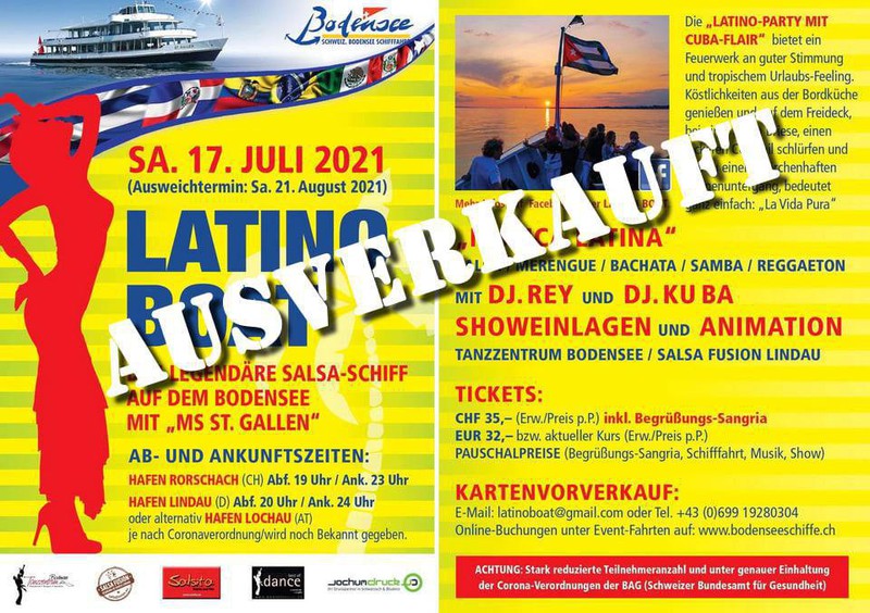 Super Stimmung auf dem legendären Latino Boat, bei super Wetter, mit Sonnenuntergang und Vollmond. Mit DJ Kuba und DJ Reynaldo sowie spektakulären Shows von Salsafusion.de und Tanzsportcenter Bodensee. Unter Einhaltung aller behördlicher Auflagen konnte dieses Ereignis auch dieses Jahr wieder erfolgreich durchgeführt werden. Wer das verpasst hat: nächstes Jahr gibt es dieses Event wieder! https://www.facebook.com/Latino-Boat-630509393702932