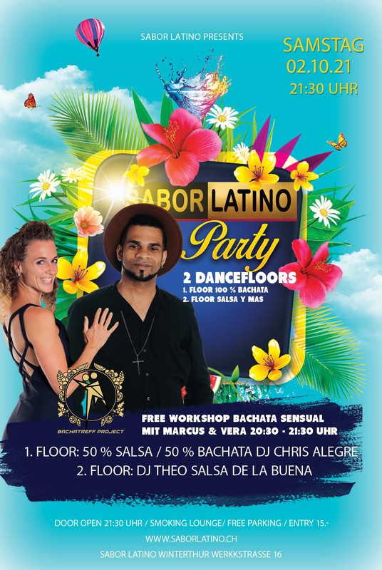 Ein Highlight auf 2 Dancefloors mit gratis Workshop! Vor dem Event findet ein Bachata Sensual Workshop mit Marcus & Vera Floor 1: DJ Chris Alegre mit 100 % Bachata Floor 2: DJ Theo mit Salsa de la buena Der Workshop von 20:30 - 21:30 Uhr ist gratis und es ist keine Anmeldung nötig. Das Warten hat ein Ende und wir dürfen endlich wieder tanzen. Fast alle Massnahmen wurden zurück genommen. Es sind keine Maske und Kontakttracing mehr nötig. Alles was es noch braucht um in das Sabor Latino eingelassen zu werden ist ein Covid19 Zertifikat. Wer noch keines hat, bekommt es in den Testzentren (Rosenberg und Kantonsspital, im Permanence beim HB und einigen Apotheken in dem man einen PCR oder Antigentest macht. Die Tests sind gratis. Wo man das Zertifikat im Kanton Zürich noch bekommt: https://www.avkz.ch Alle Infos zum Zertifikat. www.saborlatino.ch