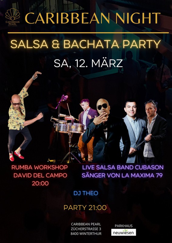 Salsa und Bachata Tanzparty Es erwartet dich eine tolle Sala- und Bachata- Tanznacht, mit tollen Tänzer, Salsa LIVE MUSIC BAND und einen lehrreichen Rumba Tanz-Workshop mit Special Guest David Del Campo. 20:00 – 21:00 Rumba Workshop mit David del Campo aus Turin (Italien) Ab 21:00 Party startet mit DJ Theo SALSA LIVE BAND CUBASON (Sänger von La Maxima 79) aus Italien ab 22:00 Uhr Tickets im Vorverkauf 25 CHF. Auf Eventfrog erhältlich: https://eventfrog.ch/de/p/party/latin-brasil/caribbean-night-salsa-und-bachata-mit-salsa-live-band-6888893375081596930.html Tickets Abendkasse 35 CHF Einlass nur mit 2G+ (Mögliche Änderungen der Massnahmen vom Bundesrat bis dann) Instagram: @caribbeanpearl.ch facebook: @caribbeanpearl.ch https://eventfrog.ch/de/p/party/latin-brasil/caribbean-night-salsa-und-bachata-mit-salsa-live-band-6888893375081596930.html