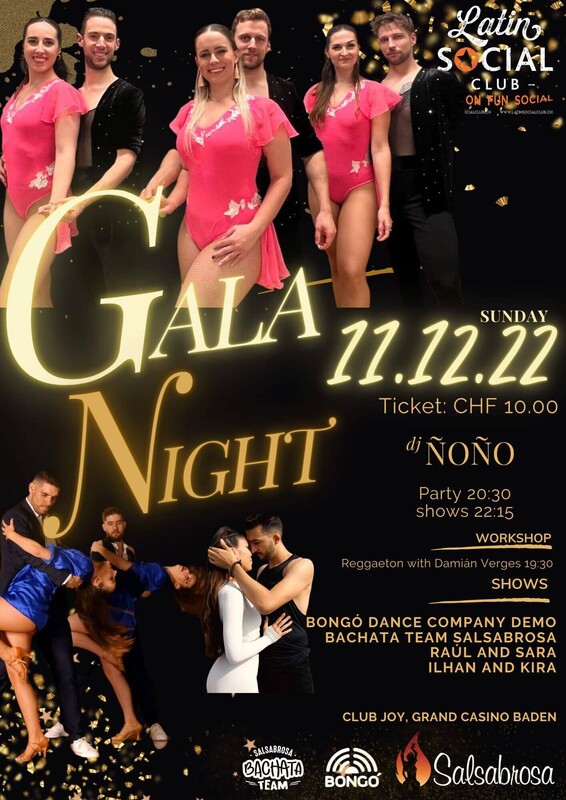 Workshop ab 19:30 Uhr - Reggaeton Shows: - Bongo Dance Company - Bachata Team Salsabrosa - Raul y Sara - Ilhan y Kira Herzlich willkommen bei Latin Social Club! Wir sind Veranstalter diverser Events für Liebhaber der latinoamerikanischen Musik/des latinoamerikanischen Tanzes im Aargau. Zum Abschluss der Woche die heissen Rhythmen der lateinamerikanischen Musik nochmals erleben. Du wirst es spüren, ob an der Bar oder auf der Tanzfläche mit deinem Gegenüber, das geheimnisvolle, faszinierende Etwas, dass das Salsaspektakel ausmacht. Zudem heizt unser DJ dem Drang zu Tanzen ordentlich ein und sorgt dafür, dass der Club lebt!! In den schönen Räumlichkeiten des Clubs Joy`s, im Gran Casino Baden, wird jedes Tanzfeeling noch verstärkt. Das Elegante Ambiente, das durchdachte Konzept und das Echtholzparket machen den Club Joy zum perfekten Ort zum Tanzen. Euer Latin Social Club Team