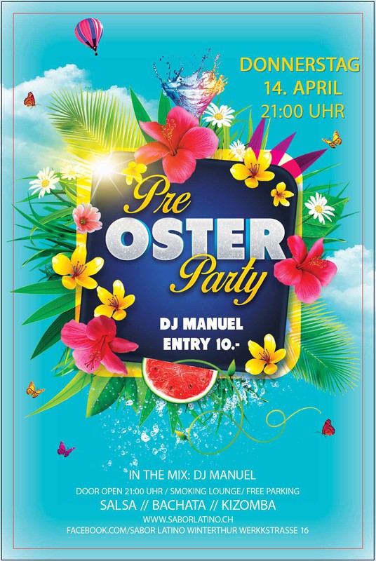 Pre Osterparty: Mit einem lockeren Tänzchen und bester Salsa, Bachata und Kizomba Musik von DJ Manuel starten wir in die Osterfeiertage. Vor dem Club gibt es gratis Parkplätze und mit dem ÖV ist der Club am Wochenende rund um die Uhr erreichbar. www.saborlatino.ch