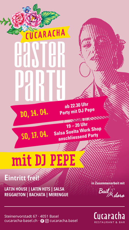 CUCARACHA LATIN NIGHT GRÜNDONNERSTAG SPECIAL mit DJ PEPE 14. April 2022 Donnerstag vor Feiertag! Wir treffen uns heute Donnerstag ab 22:30 im Cucaracha, Basel und feiern wir eine tolle Party. Am Freitag ist frei und deshalb können wir ausgelassen feiern. Lass uns das Leben geniessen mit bester Latinmusik serviert vom Lokalmatador DJ Pepe. SALSA - BACHATA - REGGAETON - DEMBOW - BRASILHITS - LATINHITS - LATINHOUSE - MERENGUE U.V.M. HASTA LA PISTA BABYS! Elegancia - Sabor - Fiesta https://fb.me/e/1F7KCDitd https://fb.me/e/1F7KCDitd
