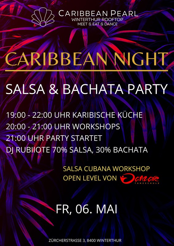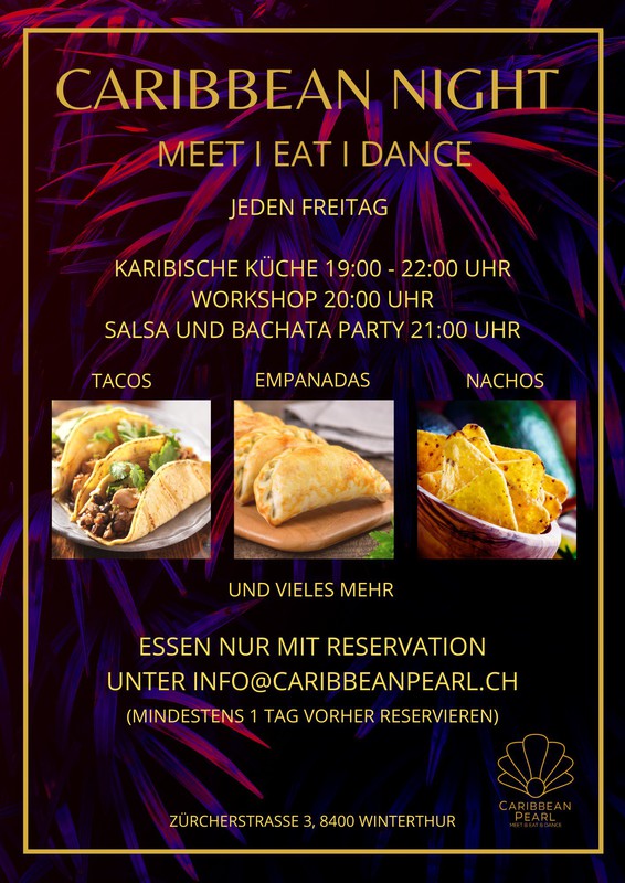 Die Salsa und Bachata Tanzparty im karibischen Rooftop-Lokal in Winterthur. Geniesse einen schönen Tanzabend mit guter Musik und leckeren Drinks in einer Location mit Flair. 19:00 - 22:00 Uhr lateinamerikanisches Essen wie Tacos, Empanadas und Vieles mehr ! Nur mit Reservation über info@caribbeanpearl.ch (mind. 1 Tag vorher Tisch reservieren) 20:00 Uhr Salsa Cubana Workshop Open Level mit Pascal und Sabrina von der Tanzschule Danzare in Winterthur 21:00 Uhr Salsa und Bachata Party mit DJ Rubiiote (70% Salsa, 30% Bachata) Workshop inkl. im Ticketpreis. Tickets hier erhältlich: https://eventfrog.ch/de/p/party/latin-brasil/caribbean-night-salsa-und-bachata-party-mit-tanzworkshop-6927166942907105876.html Wir befinden uns beim Bahnhof Winterthur im obersten Stock des Kesselhauses. Günstige Parkplätze findest du im Parkhaus Neuwiesen (0.50/h). Folge uns auf Social Media: IG:@caribbeanpearl.ch FB: @caribbeanpearl.ch TikTok: @caribbeanpearl.ch https://caribbeanpearl.ch/event/caribbean-night/