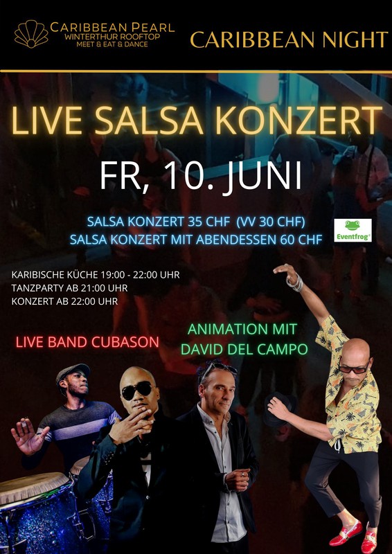 Mal eine etwas speziellere Caribbean Night ! Am 10. Juni wird eine Salsa Band namens CUBASON bei uns im Caribbean Pearl live spielen ! Verpasse diesen einzigartigen Tanzabend mit Live Musik nicht. Animation mit Rumba Tänzer David del Campo aus Italien! Abendessen nur auf Reservation via Email (info@caribbeanpearl.ch) von 19:00 - 22:00 Uhr. Menu: -Tacos mit Rinds, Poulet oder Soja - Empanadas : mit Gemüse, mit Poulet und Gemüse, Chili und Gemüse oder Käse mit Gemüse. - Dessert Ab 21:00 Uhr startet die Party mit DJ Rubiiote (70% Salsa, 30% Bachata) und ab 22:00 Uhr findet dann das Konzert statt. Ticket Preise: Salsa Konzert + Party : 35 CHF (Vorverkauf 30 CHF) Abendessen+ Konzert + Party: 60 CHF (bitte mindestens 1 Tag vorher reservieren) Tickets hier erhältlich : https://eventfrog.ch/de/p/party/latin-brasil/caribbean-night-mit-salsa-live-band-6927176863778218940.html Wir befinden uns beim Bahnhof Winterthur im obersten Stock des Kesselhauses. Günstige Parkplätze findest du im Parkhaus Neuwiesen (0.50/h). Wir freuen uns auf dich ! Folge uns auf Social Media: IG:@caribbeanpearl.ch FB: @caribbeanpearl.ch TikTok: @caribbeanpearl.ch https://eventfrog.ch/de/p/party/latin-brasil/caribbean-night-mit-salsa-live-band-6927176863778218940.html