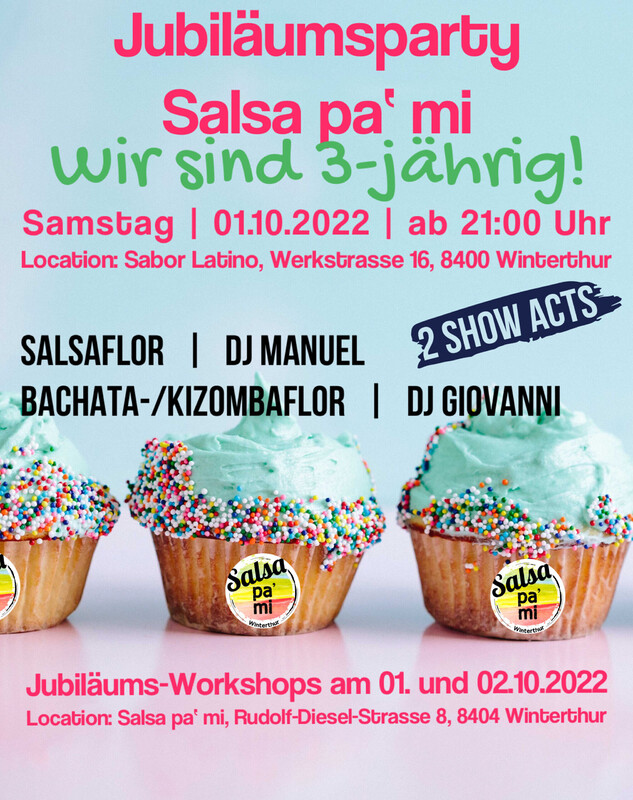 1. Oktober – 2. Oktober | Samstag | 21:00 – 04:00 Uhr https://salsapami.ch/event/jubileumsparty/ Liebe Tanzbegeisterte Wir sind überglücklich, am Samstag, 01.10.2022 bereits das dreijährige Jubiläum von Salsa pa` mi zu feiern! Wir freuen uns riesig, dich an unserer Party zu begrüssen und mit dir anzustossen! Salsa- und Bachataparty ° Wo: Sabor Latino, Werkstrasse 16, 8400 Winterthur | https://saborlatino.ch/ ° Wann: Samstag, 1.10.2022, ab 21:00 Uhr ° Eintritt: 17.00 CHF ° Finger Food: Mit kleinen Köstlichkeiten sorgen wir uns um die Gaumenfreude ° Show Darbietung: Wir werden den Abend mit 1-2 Shows bereichern ° Parkieren: Parkplätze vor der Location vorhanden ******************************************************************* Tanzworkshops (=> Programm folgt) ° Wo: Tanzschule Salsa pa‘ mi, Rudolf-Diesel-Strasse 8, 8404 Winterthur ° Wann: – Samstag 01.10.2022, zwischen 12.00 – 18.00 Uhr – Sonntag 02.10.2022, zwischen 12.00 – 18.00 Uhr ° Weitere Infos: https://salsapami.ch/event/jubilaeums-workshops/ Schuhstand powered by: Dancing Queens | https://www.dancingqueens.ch/
