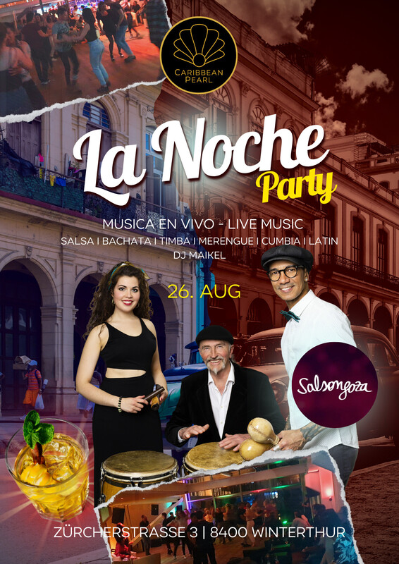 La Noche Party mit der Latin Band «Salsongoza» und «DJ Maikel» Live Music – Musica en vivo Salsa, Bachata, Merengue, Timba, Cumbia, Reggaeton und Latin Pop Party ab 22:00 Uhr Geniesse einen unvergesslichen Tanzabend mit Live Musik in einer Location mit Flair. Wir befinden uns beim Bahnhof Winterthur im obersten Stock des Kesselhauses (Eingang seitlich des Gebäudes). Günstige Parkplätze findest du im Neuwiesen Parkhaus gegenüber (ab 18:00 Uhr nur 0.50/h). Über Salsongoza: SALSONGOZA, The Latin Band, vereint MusikerInnen aus Kuba, Spanien, Panama und der Schweiz. Ein modernes und vielseitiges Repertoire aus Salsa, Timba Bachata, Merengue, Reggaeton und Cumbia bringt garantiert jeden Anlass zum Kochen! Nebst vielen Klassikern der karibischen Musik spielt die Band auch moderne Eigenkompositionen des kubanischen Gründers und Bandleaders, David Robertson. Die fünfköpfige Live-Band klingt mit ihren eigenen Backing Tracks voll und energiegeladen wie ein ganzes Latin Orchester. Ausserdem werden die Auftritte mit Animation angereichert. Mittanzen ist da schon beinahe Pflicht! www.caribbeanpearl.ch https://eventfrog.ch/de/p/konzert/latin/la-noche-party-mit-live-band-salsongoza-und-dj-maikel-6966038183243845222.html
