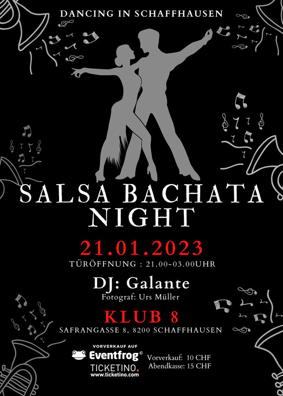 Neu! Salsa Party im Klub 8, Schaffhausen. DJ Galante wird am 21.01.2023 hier in Schaffhausen tolle Musik auflegen. Wir tanzen durch die Nacht! Der heisse Latino- Abend wird durch den Fotografen Urs Müller festgehalten. Wir sehen uns am 21.01.2023 neu in Klub 8! Salsa Bachata Night Datum: 21.01.2022 Zeit: 21.00- 03.00Uhr Location: Klub 8 (Safrangasse 8, 8200 Schaffhausen) DJ: Galante Fotograf: Urs Müller Eintritt Vorverkauf: 10CHF Abendkasse: 15CHF Vorverkauf via Eventfrog: https://eventfrog.ch/de/p/party/latin-brasil/salsa-bachata-night-6999713190402505080.html Vorverkauf via Ticketino: https://www.ticketino.com/de/event/Salsa-Bachata-Night/171649 https://klub8.ch/