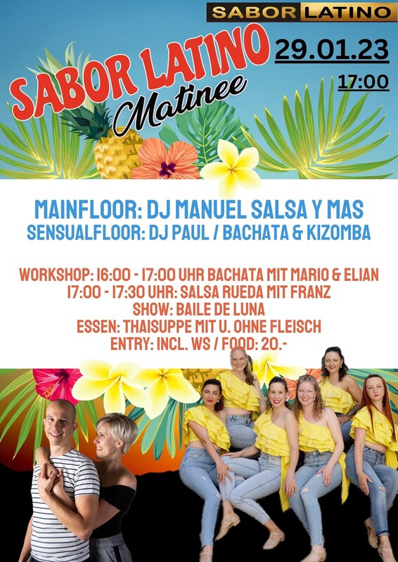 Sabor Latino Matinee, die besondere Party am Sonntag Nachmittag mit viel Erfolg. An dieser Party triffst Du tolle Menschen, auf 2 Dancefloors werden Bachata, Kizomba und natürlich Salsa gespielt. Eine Show ist jedes mal Teil des Programms und zur Stärkung gibt es auch etwas zum Essen. Floor 1: DJ Manuel Salsa y mas Floor 2: DJ Paul Kizomba & Bachata Programm: 16:00 - 17:00 Uhr Bachataworkshop mit Mario & Eliane 17:00 - 17:30 Uhr Rueda mit Franz 19:00 Uhr: Show: Baile de Luna 19:30 Uhr: Essen: Thaisuppe Entry incl. Garderobe, Workshops und Essen: 20.- https://saborlatino.ch/event/sabor-latino-matinee-2/