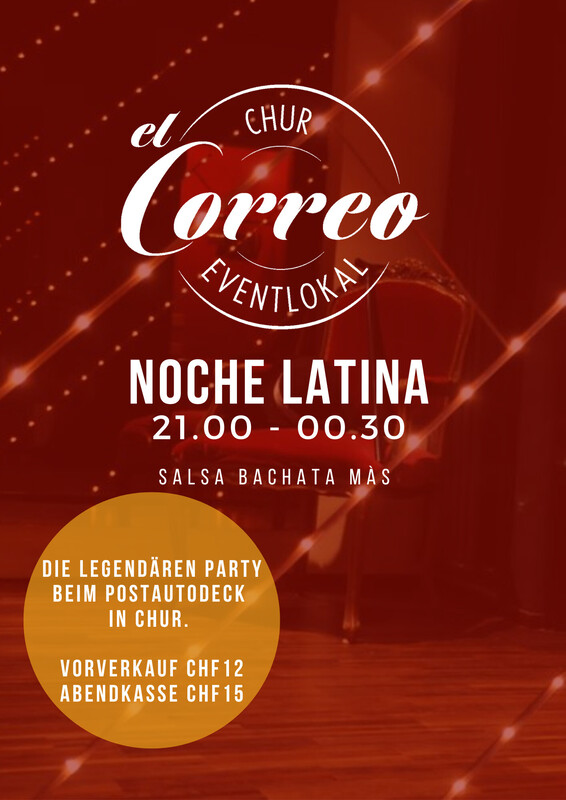 Die beliebte Noche Latina im El Correo Chur am Postautodeck. Tanze zu heissen Rhytmen und bring den Tanzboden zum glühen. Dj's aus Zürich, Deutschland, Cuba, Liechtenstein... geben jeweils den Takt an. Und wem es zu heiss wird, der kann sich an der Bar mit einem kühlen Drink abkühlen. Vorverkauf via Eventfrog: CHF 12 Abendkasse: CHF 15 https://www.facebook.com/ElCorreoChur