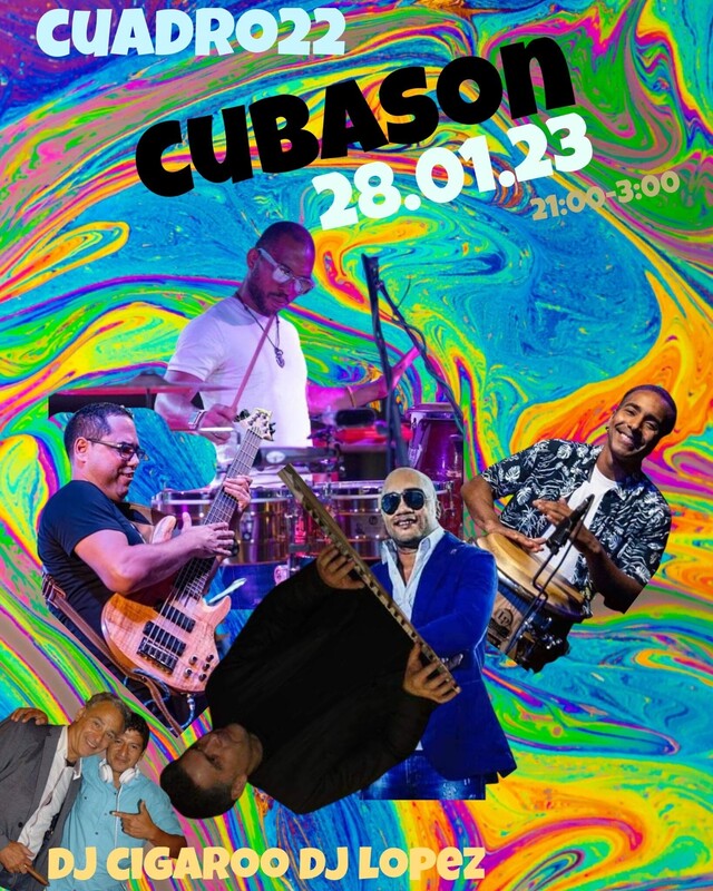 CUBASON Die Salsa-Band CUBASON bringt ihren Fans eine frische Interpretation des Old-School-Salsa-Sounds. Die Musik ist der Ort, an dem Salsa-Musiker, Salsa-DJs und Salsa-Tänzer dank der einzigartigen Vision und des einzigartigen Stils der Band zusammenkommen und die Tanzfläche zum beben bringen. Nach dem Konzert sorgen DJ Lopez und DJ Cigarro weiter für Tanz-Stimmung sorgen. Besetzung: Yoris Beltran, Gesang Juan Carlos Avila, Bass Jorge Caceda, Keys Damian Carrera Fernandez, Perkussion Edwin de La Torre: Perkussion Türöffnung 20.30 Uhr Konzertbeginn ab 21 Uhr Ende 03 Uhr Eintritt Fr. 30.- https://www.cuadro22.com/program