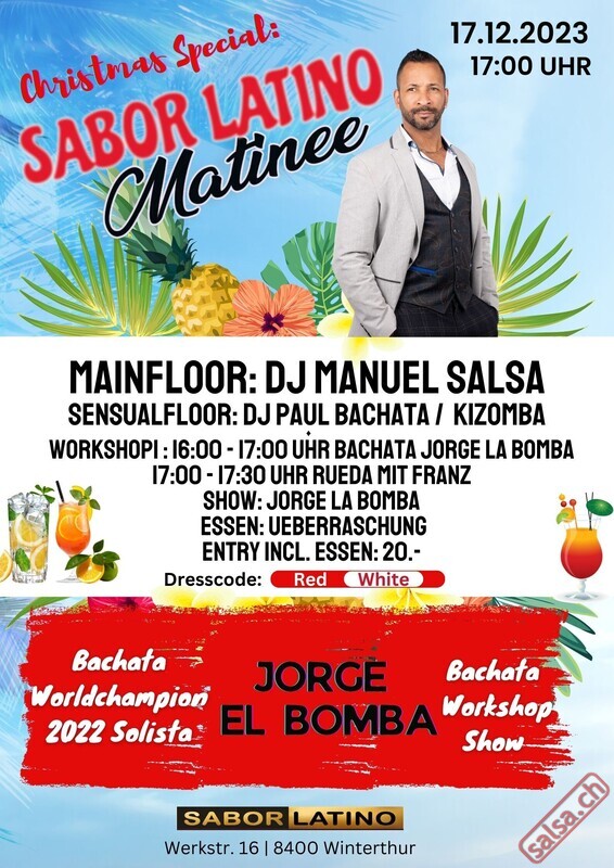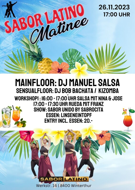 Sabor Latino Matinee, die besondere Party am Sonntag Nachmittag mit viel Erfolg. An dieser Party triffst Du tolle Menschen, auf 2 Dancefloors werden Bachata, Kizomba und natürlich Salsa gespielt. Eine Show ist jedes Mal Teil des Programms und zur Stärkung gibt es auch etwas zum Essen. Floor 1: DJ Manuel Salsa y mas Floor 2: DJ Bob Kizomba & Bachata Programm: Workshop 1:16:00 - 17:00 Uhr Salsa mit Jose & Nina Workshop 2: 17:00 - 17:30 Uhr Rueda mit Franz 19:00 Uhr: Show: Sabor Unido by Sabrocita 19 :30 Uhr: Essen: Linseneintopf Eintritt inkl. Garderobe, Workshops und Essen: 20.- https://saborlatino.ch/event/sabor-latino-matinee