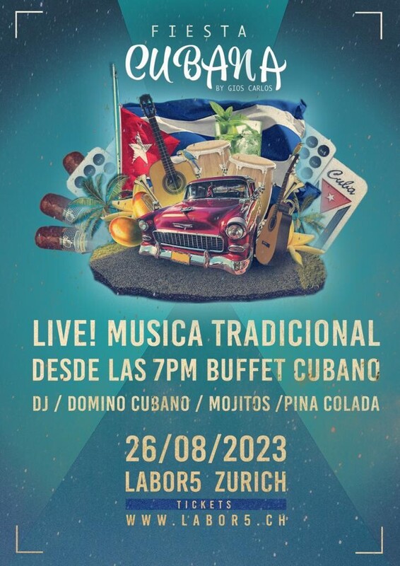 Kuba- Flair mitten in Zürich, zum Apéro ein gut schmeckender Mojito und dazu einige Rhythmen und Klänge traditioneller kubanischer Live-Musik. Danach verführt dich Chefkoch und Veranstalter Gios Carlos an sein Buffet à discrétion welches vollgepackt mit Leckereien aus seiner Heimat ist. Moros y Cristiano, Yuca con Mojo, Lomo Asado sind nur einige kulinarischen Beispiele, die dich erwarten. Ein Glas Havana Club Especial in Kombination einer Habano zum Verdauen oder fordere jemanden im Domino Cubano aus in unserer Spiellounge. Ab 22 Uhr geht es dann so richtig los. Die kubanische Live-Band Rakachan und Dj Carlos verzaubern die Nacht mit karibischer Musik. Es wird gefeiert und getanzt bis in die frühen Morgenstunden. Tickets gibt es im Vorverkauf inkl. Buffet ab 19.00 Uhr für CHF 40.- oder ohne Essen nur für die Party ab 21.30 Uhr für CHF 15.-. An der Abendkasse ab 21.30 Uhr ist der Eintritt CHF 25.-. Estilo cubano en el centro de Zúrich, un buen mojito para el aperitivo y unos ritmos y sones de música tradicional cubana en vivo. Luego, el Chef y organizador, Gios Carlos, lo tentará con su buffet libre, que está repleto de delicias de su tierra natal. Moros y Cristiano, Yuca con Mojo, Lomo Asado son solo algunos ejemplos culinarios que te esperan. Un buen trago de Havana Club Especial combinado con un Habano para digerir o desafiar a alguien con un juego de Domino Cubano en nuestro salón de juegos. A partir de las 22 h empieza de verdad. La banda cubana en vivo Rakachan y Dj Carlos deleitarán la noche con música caribeña. Hay fiesta y baile hasta altas horas de la madrugada. Los boletos están disponibles por adelantado incluyendo un buffet a partir de las 7 pm por CHF 40.- o sin comida solo para la fiesta a partir de las 9.30 pm por CHF 15.-. En la taquilla a partir de las 21:30 la entrada cuesta CHF 25.-. Artisten & DJs Rakachan Live & Dj Alex https://www.labor5.ch/events/Fiesta-Cubana-by-Gios-Carlos26-08-2023-1900146?fbclid=IwAR075biFkG-gKnV3y5M_XHDsXPSCTiGGNtb8TvfonegM7DWYE9TF_a93Um8