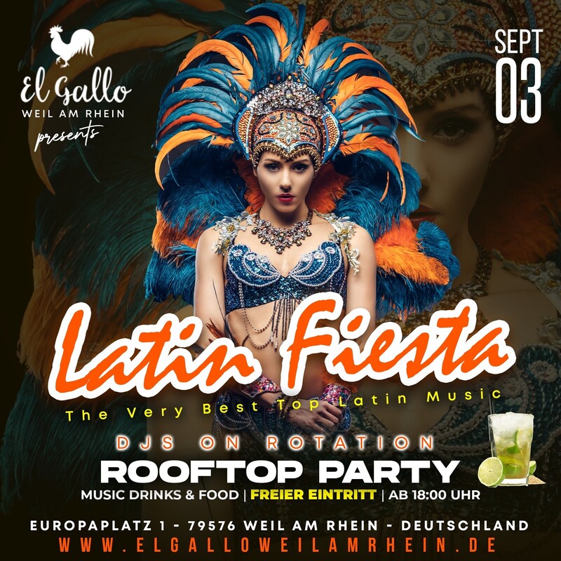 Latin Fiesta | Rooftop Party | Freier Eintritt Sonntag 03.09.2023 | Ab 18:00 bis 24:00 Uhr Freier Eintritt - • DJs On Rotation • The Very Best Of Latin Music ( Salsa Bachata Merengue und mehr...) • Drinks, Food & Party - • Ab 18:00 Uhr | Bachata Workshop By : Kira & Ilhan ( Bailamos Salsa Tanzschule Basel ) - El Gallo Restaurant Europaplatz 1, 79576 Weil am Rhein, Deutschland https://elgalloweilamrhein.de/