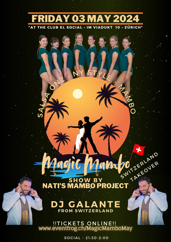 **Salsa On2 - NY Style - Mambo** ----------------- ...with DJ Galante from Switzerland ----------------- Show By - Nati's Mambo Project ----------------- Tickets ONLY ONLINE: www.eventfrog.ch/MagicMamboMay Early Bird bis 26.04.2024 !!LIMITED CAPACITY!! https://www.facebook.com/ https://www.facebook.com/profile.php?id=100082993887930 https://www.facebook.com/profile.php?id=100082993887930