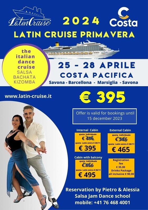 Liebe Tanzfreunde, im kommenden Frühling laden wir euch herzlich ein, mit uns auf einem Kreuzfahrtschiff über die Wellen des Mittelmeers zu tanzen. Freut euch auf zahlreiche Salsa , Bachata, Kizomba Workshops und Partys während unserer Reise, die uns durch Savona, Marseille, Barcelona und weitere faszinierende Städte führen wird. Wenn ihr interessiert seid, schließt euch gerne unserer SALSA JAM Gruppe an. Wir freuen uns auf ein lateinamerikanisches Abenteuer auf hoher See! Euer SALSA JAM Team" Info & Anmeldungen 076 468 40 01 https://salsajam.ch Ticketsverkauf hier https://latin-cruise.it Promo-Code: SALSA JAM - Pietro & Alessia (auswählen) Spezialofferte für EarlyBirds !!! https://latin-cruise.it https://latin-cruise.it