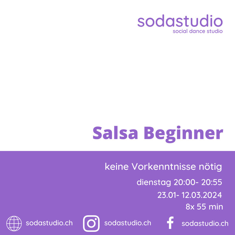 Starte deine Salsa Reise mit uns! Unsere Salsa Beginner Class richtet sich an Teilnehmer ohne Vorkenntnisse, an Wiedereinsteiger und an alle, die Interesse haben ihre Grundlagen auszubauen und zu festigen. In 8 Lektionen lernst du die wichtigsten Grundlagen des Salsa, damit du in Kürze auf der Tanzfläche Spass haben kannst. Wir erklären dir den Aufbau von Salsa Musik und du lernst anhand von coolen Übungen die Rhythmik zu verstehen und mit deinem Körper umzusetzen. Lass dich von uns auf eine Reise voller Spass, Musikalität und Lebensfreude mitnehmen! Was du in diesem Kurs lernst: - Du lernst den Grundschritt und verschiedene Variationen des Grundschritts. - Wir schulen dein Taktgefühl und vermitteln dir erste Konzepte im Führen und Folgen. - Du lernst die wichtigsten Positionen und erste Figuren. - Du übst mit und ohne Partner. Kursdaten und Preis: DI 23. Januar bis DI 12. März 2024 | 20:00 - 20:55 8x 55 Min. | 240.-/Person Deine Tanzlehrer: Wir, Francesco und Mirjam von sodastudio, freuen uns darauf, dich auf deinem tänzerischen Weg zu begleiten und mit dir viele unterhaltsame und lehrreiche Stunden zu verbringen! Kontakt bei Fragen: Du kannst uns jederzeit über unser Kontaktformular auf sodastudio.ch oder per Mail info@sodastudio.ch kontakieren. Oder Anmeldung direkt über: https://www.silkk.ch/kurse/Salsa-Starter24-10-2023-19009-23