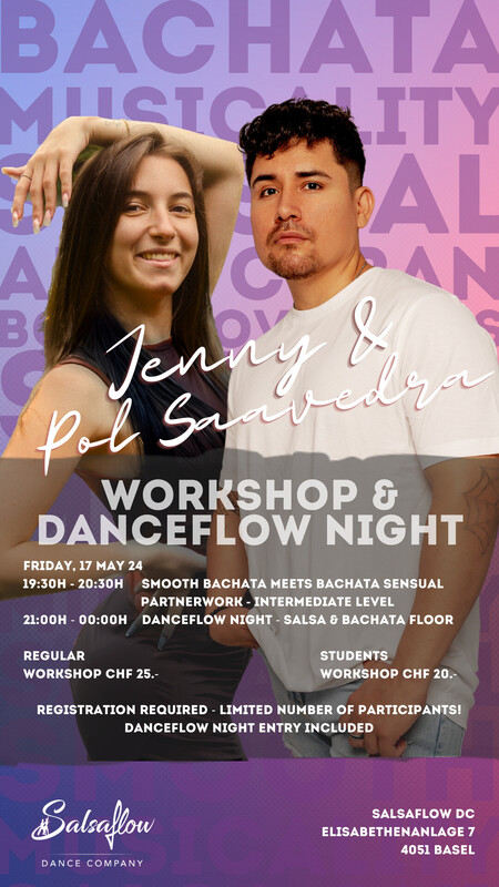 Kommt zu unserer Danceflow Night, in welcher ihr in lockerer Atmosphäre Freunde treffen und miteinander tanzen und üben könnt. Ob Salsa, Bachata, Cha Cha oder eine Rueda Cubana, es ist für jeden etwas dabei! Lass Dich von DJ Rafa Rivas auf dem Salsa Floor überraschen. Für den Bachata Floor haben wir eine Playlist, erstellt von unseren Bachateras, welche jede Woche überarbeitet wird. Ihr dürft auch gerne vor Ort eure wünsche anbringen! :) Jeden dritten Freitag im Monat findet noch ein spezieller Workshop statt - mehr Infos auf unserer Website. Workshop: Smooth Bachata meets Bachata Sensual mit Jenny & Pol Saavedra CHF 25.- / Studenten CHF 20.- (Danceflow Night Eintritt inklusive) Nur Danceflow Night: Salsaflow Schüler CHF 5.- Externe CHF 10.- 21:00h - 00:00h / 2 Floors (Salsa mit DJ Rafa & Bachata) https://www.salsaflow-dc.com/kurse/workshops/