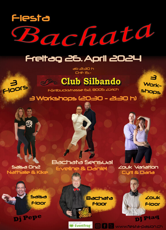Fiesta Bachata - Deine Social-Dance Party am 4. Freitag des Monates im Club Silbando! Mit 3 Workshops und 3 Floors! Das erwartet dich: *3 Workshops* von 20:30 - 21:30 Uhr (CHF 25.- inkl. Party-Eintritt): - Bachata Sensual Workshop mit Eveline & Daniel https://eventfrog.ch/de/p/kurse-seminare/musik-tanz/bachata-sensual-workshop-mit-eveline-daniel-7173417005143246189.html - Salsa On2 (Mittelstufe) mit Nathalie & Kike (SalsaLuca) https://eventfrog.ch/de/p/kurse-seminare/musik-tanz/salsa-on2-workshop-mit-nathalie-kike-salsaluca-7173418650556144457.html - Zouk Basic Variations mit Cyril & Daria (Zoukessence) https://eventfrog.ch/de/p/kurse-seminare/musik-tanz/zouk-basic-variations-mit-cyril-daria-zoukessence-7173417800135829771.html *3 Floors* Party ab 21:30 Uhr (CHF 15.-): - Floor 1: Bachata mit DJ Ñoño - Floor 2: Salsa mit DJ Pepe - Floor 3: Zouk mit DJ Ptaq Vorverkauf Workshops und Party-Eintritt via Eventfrog: https://eventfrog.ch/de/p/party/latin-brasil/fiesta-bachata-7173422779101807373.html ●●● WHATSAPP/TELEGRAM: Komm in die WhatsApp- oder Telegram-Gruppe und bleibe über die kommenden Events informiert: Whatsapp: https://chat.whatsapp.com/DHgqcB4Pe8aFmjpYt2v03c Telegram: https://www.t.me/fiestapasion ●●● Fiesta Bachata Daten 2024: jeweils am 4. Freitag des Monates 24.05.2024 28.06.2024 Sommerpause im Juli 23.08.2024 27.09.2024 25.10.2024 22.11.2024 27.12.2024 ●●● Euer Fiesta Pasion Team https://eventfrog.ch/de/p/party/latin-brasil/fiesta-bachata-7173422779101807373.html