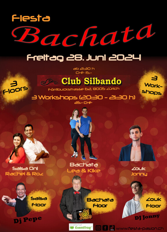 Fiesta Bachata - Deine Social-Dance Party am 4. Freitag des Monates im Club Silbando! Mit 3 Workshops und 3 Floors! Das erwartet dich: *3 Workshops* von 20:30 - 21:30 Uhr (CHF 25.- inkl. Party-Eintritt): - Bachata Workshop mit Lea & Kike (SalsaOlé) https://eventfrog.ch/de/p/kurse-seminare/musik-tanz/bachata-workshop-mit-lea-kike-salsaole-7195891505151604604.html - Salsa Workshop mit Rachel & Roz (Rhythmia) https://eventfrog.ch/de/p/kurse-seminare/musik-tanz/salsa-on1-workshop-mit-rachel-roz-rhythmia-7195892769650317380.html - Zouk mit Jonny (Zoukessence) https://eventfrog.ch/de/p/kurse-seminare/musik-tanz/zouk-workshop-mit-jonny-zoukessence-7195892165653759377.html *3 Floors* Party ab 21:30 Uhr (CHF 15.-): - Floor 1: Bachata mit DJ Ñoño - Floor 2: Salsa mit DJ Pepe - Floor 3: Zouk mit DJ Jonny Weitere Infos zu den Workshops und DJs werden zeitnah folgen. Vorverkauf Workshops und Party-Eintritt via Eventfrog: https://eventfrog.ch/de/p/party/latin-brasil/fiesta-bachata-7195893174299997317.html ●●● WHATSAPP/TELEGRAM: Komm in die WhatsApp- oder Telegram-Gruppe und bleibe über die kommenden Events informiert: Whatsapp: https://chat.whatsapp.com/DHgqcB4Pe8aFmjpYt2v03c Telegram: https://www.t.me/fiestapasion ●●● Fiesta Bachata Daten 2024: jeweils am 4. Freitag des Monates Sommerpause im Juli 23.08.2024 27.09.2024 25.10.2024 22.11.2024 27.12.2024 ●●● Euer Fiesta Pasion Team https://eventfrog.ch/de/p/party/latin-brasil/fiesta-bachata-7195893174299997317.html