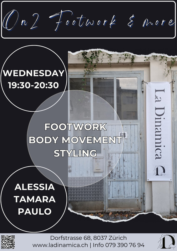 On2 Classes Open Level This class will focus on different skills: - footwork - body movement - styling - timing etc. for men & women with Alessia, Paulo and Tamara Wir freuen uns auf euch! Preise: Einzellektion 30CHF 5er Pass 140CHF 10er Pass 250CHF 📍 Dorfstrasse 68, 8037 Zürich Info +41 79 390 76 94 Instagram: ladinamica_ds www.ladinamica.ch