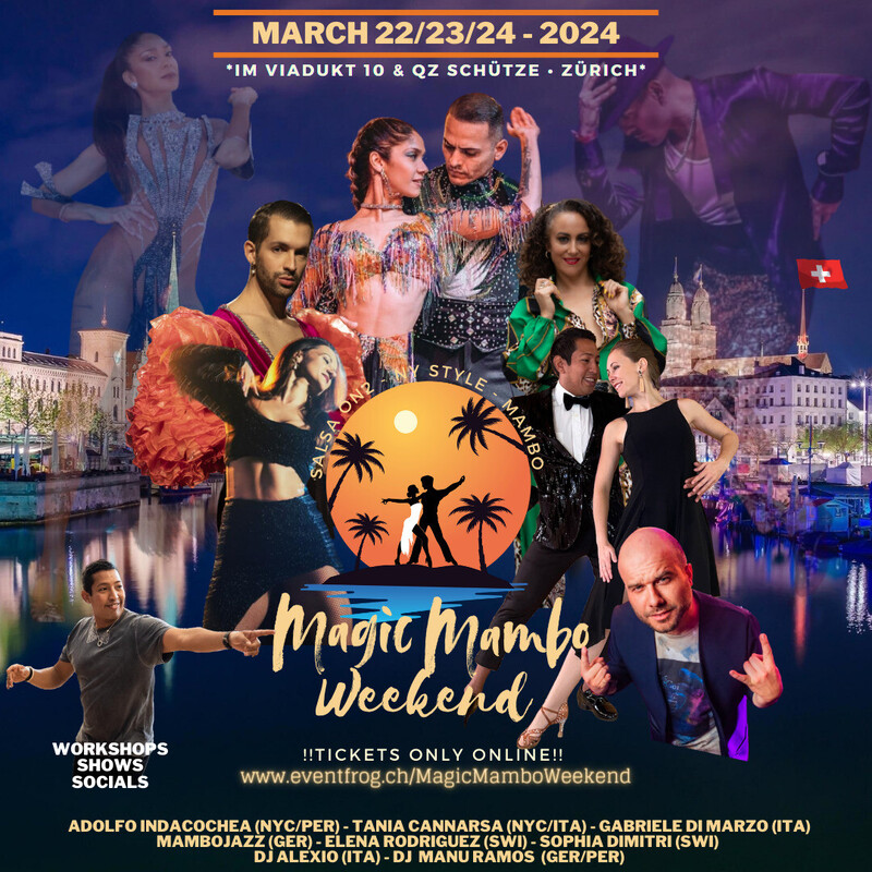 A Weekend filled with Workshops, Shows and Social Dancing. !!Mambo-Mambo-Mambo!! Artists: -Adolfo Indacochea (New York/Peru) -Tania Cannarsa (New York/Italy) -Gabriele Di Marzo (Italy) -MamboJazz (Germany) -Elena Rodriguez (Switzerland) -Sophia Dimitri (Switzerland) DJs: -Alexio from Italy -Manu Ramos from Peru/Germany Workshops: Partnerwork, Shines, Technique, Body Movement on Saturday and Sunday. Social Dancing and Shows: Social and Shows on Friday and Saturday evening. Location: -Friday: El Social, Im Viadukt 10, Viaduktstrasse 67, 8005 Zurich -Saturday + Sunday: QZ Schütze, Heinrichstrasse 238, 8005 Zürich Tickets: www.eventfrog.ch/MagicMamboWeekend https://www.facebook.com/events/584366759980962?ref=newsfeed