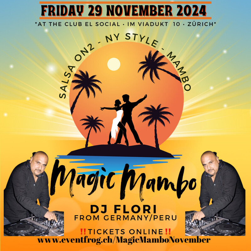 **Salsa On2 - NY Style - Mambo** ----------------- Music by DJ Flori (Germany - Peru) ----------------- Tickets www.eventfrog.ch/MagicMamboNovember !Limited Capacity! https://www.facebook.com/profile.php?id=100082993887930 www.magicmambo.ch