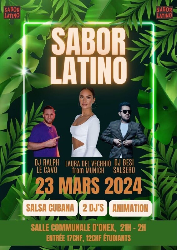 Grande Soirée Sabor Latino Salsa Samedi 23 mars 2024 A la salle communale d'Onex Aux platines DJ Ralph Le Cavo & DJ Besi Salsero Et une invitée de prestige !! On est très fiers de recevoir !!! Laura Del Vecchio de Munich, présente dans les plus importants festivals, incroyabe danseuse, elle sera sur scène pour une animation et vous faire bouger !!! Dès 21 h Entrée 17.00 chf Etudiant 12.00 chf Deux stages sont prévus également le 23 mars 14h - 15h30 Salsa Fusion (mixte) 16 h - 17h30 Lady Styling 1 cours 30.00 chf 2 cours 50.00 chf