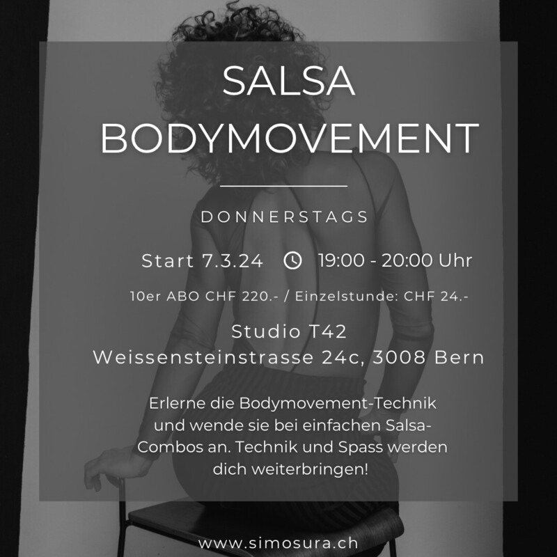 Erlerne die Bodymovement-Technik und wende sie bei einfachen Salsa-Combos an. Technik und Spass werden dich weiterbringen! www.simosura.ch