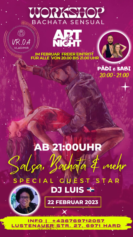 Salsa Night jeden Donnerstag im "Art of Night“ (ehemalige Nachtschicht) ab 20:00 Uhr. Im Februar freier Eintritt für alle von 20.00 bis 21.00 Uhr. Workshop Bachata Sensual mit Pädi & Sabi Kommt und geniesst mit uns in fantastischer Atmosphäre lateinamerikanische Rhythmen mit DJ Luis. Salsa, Bachata, Merengue & mehr. Adresse : Lustenauer Straße 27, 6971 Hard-Österreich Kostenlos (Sektempfang und warmes Buffet) https://www.facebook.com/vr.oa.2024