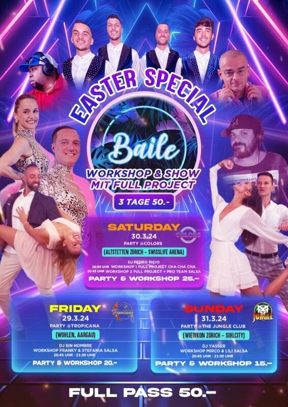 SALSA & BACHATA EVENT BAILE EVENT EASTER SPECIAL Wir offerieren 4 Workshops & Show Acts mit anschließender Party. Hier unsere Specials: *** SALSA | BACHATA *** *** 2 DANCE FLOORS *** *** 4 WORKSHOPS *** *** 2 SHOWS *** *** FULL PROJECT (IT) *** *** DJ SIN NOMBRE *** *** DJ PEDRO RICIO (IT)*** *** DJ YASSER *** Freitag: Location – Tropicana Workshop – Salsa mit Franky & Stefania 20:45 Uhr Party – 21:30 Uhr Eintritt – 20 CHF Samstag: Location – Colors Workshop – ChaChaCha mit Full Project 20:00 Uhr Workshop – Salsa Open level mit Full Project & Pro Team 20:45 Uhr Party - 21:30 UHr Eintritt – 25 CHF Sonntag: Location – Jungle Workshop - Salsa mit Mirco & Lili 20:45 Uhr Party – 21:30 Uhr Eintritt - 15 CHF Verbringe mit uns einen einzigartiges Weekend mit viel Spass, Musik und Tanz Wir freuen uns auf euch!!! === TROPICANA === Gewerbering 28 | 5610 Zürich | Wohlen === COLORS === Vulkanstrasse 130k | 8048 Zürich | Swiss Life Arena === THE JUNGLE CLUB === Kalanderplatz 1 | 8045 Zürich Wiedikon | Sihlcity https://eventfrog.ch/de/p/party/latin-brasil/baile-event-easter-special-7167771837232784764.html
