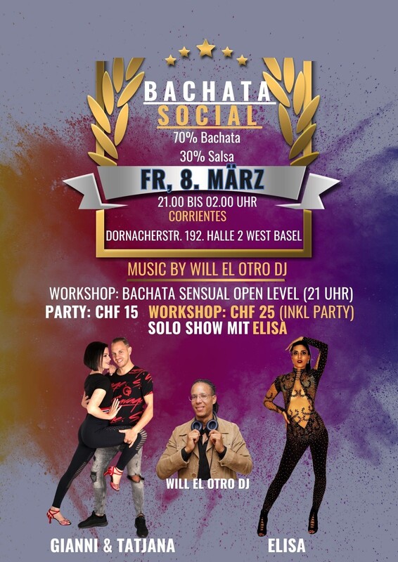 ★★★BACHATA SOCIAL★★★ 💥💥💥💥💥💥💥💥💥💥💥 -Bist du bereit für die grösste Bachata Party in Basel? -Ja?! GRANDIOS!!! Weil wir an Bachata Social Party (fast) NUR Bachata spielen und tanzen. 💃💃💃💃💃💃💃💃💃💃💃💃💃💃💃💃💃💃💃💃 Komm, geniesse und feiere mit uns mit den besten Bachata-Beats. 💥💥💥💥💥💥💥💥💥💥💥💥💥💥💥💥💥💥💥💥 Lerne andere Bachater@s kennen und, warum nicht? AUCH NEUE BACHATA SONGS!!! Vor der Party haben wir eine BACHATA - SENSUAL Workshop mit 🥳🥳🥳 Gianni & Tatjana (Bachata GT) 🥳🥳🥳 🥳🥳 🥳🥳🥳 ★★★Danach gibt es Social BACHATA mit ein wenig Salsa★★★ Workshop: 21.00 - 22.00 Uhr Party: 22.00 - 02.00 Uhr AUSSERDEM EINE HAMMER BACHATA SHOW MIT DER SCHWEIZERMEISTERIN: 🥳🥳 ELISA 🥳🥳 EINTRITT PARTY:CHF 15 WORKSHOP: CHF 25 (inkl. Party) Ort: CORRIENTES, DORNACHERSTRASSE 192, BASEL ALSO ES GILT: VERPASSEN AUF EIGENES RISIKO https://www.facebook.com/events/2075132839517913/?acontext=%7B%22event_action_history%22%3A[%7B%22surface%22%3A%22home%22%7D%2C%7B%22mechanism%22%3A%22your_upcoming_events_unit%22%2C%22surface%22%3A%22bookmark%22%7D]%2C%22ref_notif_type%22%3Anull%7D