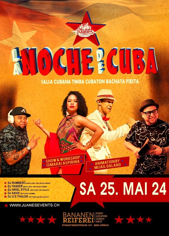 ★ LA NOCHE DE CUBA ★ Ismaray Aspirina / DJs Rumbero, Yasser & Mijail, Bananenreiferei ★ Samstag 25. Mai 2024 ★ 4 Dance Floors ★★★ ★ AB 22 JAHREN ★ DOORS: 21:30 – 04:00 UHR ★ EINTRITT CHF 20.- ★ GRATIS GARDEROBE ★ 400 AUTO PARKPLÄTZE ★ EINTRITT: BEZAHLUNG AN DER KASSE NUR BARGELD ★ GETRÄNKE-BAR: BARGELD & CREDITCARD ★★★ VERLOSUNG TICKETS. . 1X TICKET LEONI TORRES 14.09.24 AURA CLUB . 2X TICKETS LOS VAN VAN 09.06.24 Salmen Saal-ZH . 3X TICKETS WHITE SALSA & BACHATA FEVER PARTY 01.06.24 Bananenreiferei & Tanzwerk 101. ★★★ WORKSHOP 20:30 UHR BY: ISMARAI ASPIRINA . SALSA CON RUMBA . INTERMEDIATE Sie brauchen nicht zu buchen, kommen Sie direkt zum Bananenreiferei am Samstag 25. Mai 24 um 20:15 Uhr. Der Workshop Preis ist CHF 25.- Inkl. Garderobe & Party auf 4 Dance Floors. ★★★ . 00:05 UHR SHOW BY ISMARAY ASPIRINA (Cuba) . Show Name: La Rumba me llamo yo” . Fusion von Rumba und Afro ★★★ . 00:15 UHR DANCE ANIMATION BY MIJAIL GALANO & ISMARAI (Cuba) ★★★ ★ 1-MAIN FLOOR: * 100% CUBANO DJ RUMBERO DJ YASSER 100% Salsa Cubana, Timba – Rumba - Fiesta ★★★ ★ 2ND FLOOR: BACHATA: DJ ARIEL STYLE ★★★ ★ 3RD FLOOR: KIZOMBA: DJ DERECK ★★★ ★4TH FLOOR: SALSA ALLSTYLES DJ U.S. THALER ★★★ DATES 2024 LA NOCHE DE CUBA . Sa 25.05.2024 . Sa 22.06.2024 . Sa 20.07.2024 . Sa 24.08.2024 . Sa 28.09.2023 . Sa 26.10.2024 . Sa 23.11.2024 . Sa 28.12.2024 ★★★ BANANENREIFEREI Pfingstweidstrasse 101 8005 Zürich ★★★★ Bienvenidos Juanes Events