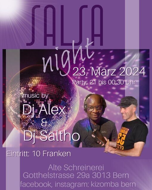 Salsa night in der Alten Schreinerei Salsa in der Alten Schreinerei geht weiter und lädt zum Tanzen und Geniessen ein. Am Samstag den 23.03.2024 21:00-00:30Uhr ist es wieder so weit. Geniesse Salsa von DJ Alex und Dj Saltho in schönem Ambiente. Eintritt: 10 Franken Location: Alte Schreinerei, Gotthelfstrasse 29a, 3013 Bern phone: 078 845 93 61 facebook, instagram: kizomba bern