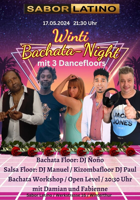 Winti Bachata Night, An der Winti Bachata Night kommen alle Tanzbegeisterten auf ihre Kosten: Bachata-Liebhaber können ihre Leidenschaft mit Bachata, Fusion und Sensual auf dem Haupttanzfloor ausleben. Doch auch Salsa- und Kizomba-Fans kommen auf dem zweiten Tanzfloor voll auf ihre Kosten. Feiere mit uns eine Nacht voller Leidenschaft, Tanz und Musik! Floor 1: DJ Ñoño: 100 % Bachata Floor 2: DJ Manuel 100 % Salsa Floor 3:0 DJ Paul 100 % Kizomba 20:30 - 21:30 Uhr: Bachata Workshop Workshop u. Party 25.- // Nur Party 15.- Kizombaworkshop: 20:00 - 21:30 Uhr / Verkauf nur über Afropfingsten Weitere Infos zur Winti Bachata Night Parken ist kein Problem: Vor dem Tanzclub Sabor Latino gibt es ausreichend kostenlose Parkplätze. Mit öffentlichen Verkehrsmitteln und Nachtbussen ist die Anreise zum und vom Sabor Latino bequem und unkompliziert. Free Parking vor dem Club Im Sabor Latino gibt es auch eine Tanzschule: www.bailemos.ch https://saborlatino.ch/event/bachata-night/