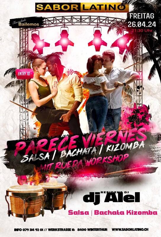 Die richtige Party, um das Wochenende zu beginnen. Mit wechselnden DJ`s immer Salsa, Bachata und Kizomba und auch mal Reggaeton. DJ Alel: Salsa, Bachata, Kizomba Free Parking vor dem Club und mit dem ÖV ist das Sabor Latino einfach erreichbar bis Haltestelle Grüzenstrasse oder Brücke. Auch die Nachtbusse fahren im 1/2 Stundentakt an und ab diesen Haltestellen. Im Sabor Latino gibt es auch eine Tanzschule: www.bailemos.ch www.saborlatino.ch