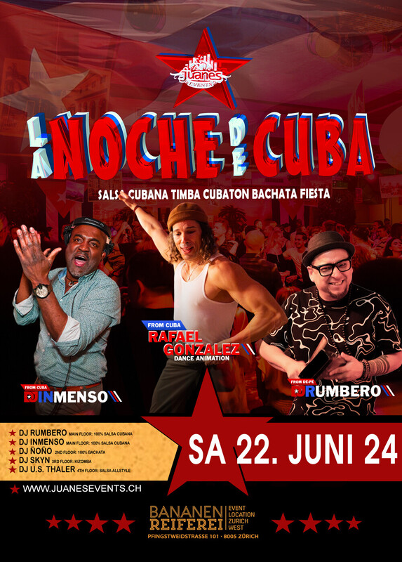 ★ LA NOCHE DE CUBA ★ DJ Rumbero - Inmenso & Rafael G. Bananenreiferei by Juanes ★ Samstag 22. Juni 2024 ★ 4 Dance Floors ★★★ ★ AB 22 JAHREN ★ DOORS: 21:30 – 04:00 UHR ★ EINTRITT CHF 20.- ★ GRATIS GARDEROBE ★ 400 AUTO PARKPLÄTZE ★ EINTRITT: BEZAHLUNG AN DER KASSE NUR BARGELD ★ GETRÄNKE-BAR: BARGELD & CREDITCARD ★★★ ★ 1-MAIN FLOOR: * 100% CUBANO DJ RUMBERO DJ INMENSO 100% Salsa Cubana, Timba – Rumba - Fiesta ★★★ ★ 2ND FLOOR: BACHATA: DJ ÑOÑO 100% Bachata Fusion, Moderna, Clasica, del Recuerdo ★★★ ★ 3RD FLOOR: KIZOMBA: DJ SKIN Kizomba - Semba - Tarraxinha - Afrohouse - Urban Kiz ★★★ ★4TH FLOOR: SALSA ALLSTYLES DJ GIOVANNI Salsa Allstyles, Puertorriqueña, Clasica, Mambo. ★★★ DATES 2024 LA NOCHE DE CUBA . Sa 22.06.2024 . Sa 20.07.2024 . Sa 24.08.2024 . Sa 28.09.2023 . Sa 26.10.2024 . Sa 23.11.2024 . Sa 28.12.2024 ★★★ BANANENREIFEREI Pfingstweidstrasse 101 8005 Zürich ★★★ Bienvenidos Juanes Events https://juanesevents.ch/