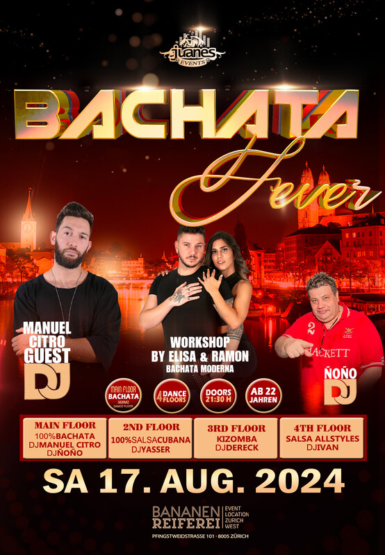 🔥 BACHATA FEVER 🔥 mit DJ MANUEL CITRO DJ ÑOÑO & Ramon & Elisa Workshop Bananenreiferei by Juanes 🔥 Samstag 17. August 2024 🔥 4 DANCE FLOORS 🔥 AB 22 JAHREN 🔥 DOORS: 21:30 – 04:00 UHR 🔥 EINTRITT CHF 20.- 🔥 EINTRITT: BEZAHLUNG AN DER KASSE NUR BARGELD 🔥 GRATIS GARDEROBE 🔥 400 AUTO PARKPLÄTZE ●●● 20:30 Uhr WORKSHOP BY RAMON & ELISA, Bachata Moderna INTERMEDIATE. ●●● Sie brauchen nicht zu buchen, kommen Sie direkt zum Bananenreiferei am Samstag, 17. August um 20:15 Uhr. Der Workshop Preis ist CHF 25.- Inkl. Garderobe & Party auf 4 Dance Floors. ●●● 🔥 MAIN FLOOR: 100% BACHATA FEVER (371 m2 Dance Floor) 🔥 DJ MANUEL CITRO 🔥 DJ ÑOÑO Bachata Fusion, Sensual, Moderna, Clasica, Del Recuerdo ●●● 🔥 2ND FLOOR: 100% SALSA CUBANA: DJ YASSER 100% Salsa Cubana, Timba, Rumba,Fiesta. ●●● 🔥 3RD FLOOR: KIZOMBA FEVER: DJ DERECK Kizomba, Semba, Tarraxinha, Afrohouse, Urban Kiz 🔥🔥🔥 🔥 4TH FLOOR: SALSA ALLSTYLES DJ IVAN Salsa Allstyles, Clasica, Puertorriqueña, Romantica 🔥🔥🔥 BANANENREIFEREI Pfingstweidstrasse 101 8005 Zürich 🔥🔥🔥 DATES 2024 BANANENREIFEREI Sa 17.08.2024 Sa 19.10.2024 Sa 16.11.2024 Sa 21.12.2024 🔥🔥🔥 FOLLOW US in INSTAGRAM https://www.instagram.com/bachata_fever_juanes/ 🔥🔥 OFFICIAL JUANES EVENTS FACEBOOK https://www.facebook.com/juanesevents 🔥🔥 Bienvenidos Juanes Events