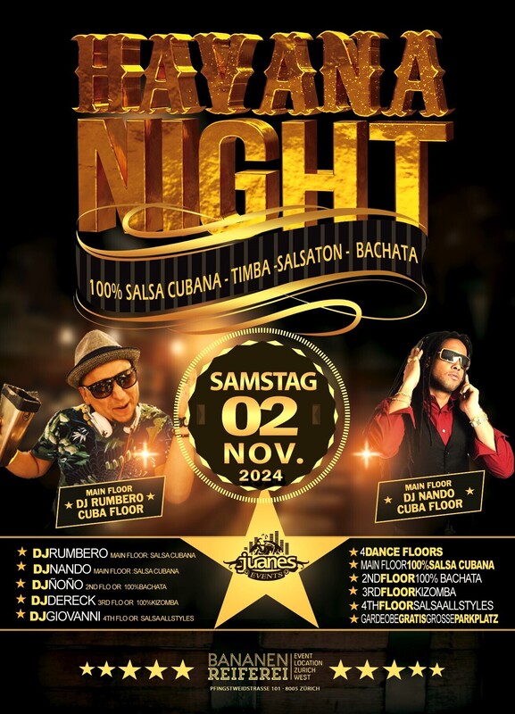 ✪ HAVANA NIGHT ✪ Special Edition DJ Rumbero DJ Nando in Bananenreiferei ✪ SAMSTAG 02. NOVEMBER 2024 ✪ 4 DANCE FLOORS ✪✪✪ ✪ AB 22 JAHREN ✪ DOORS: 21:30 – 04:00 UHR ✪ EINTRITT CHF 20.- ✪ GRATIS GARDEROBE ✪ 400 AUTO PARKPLÄTZE ✪ EINTRITT: BEZAHLUNG AN DER KASSE NUR BARGELD ✪ GETRÄNKE-BAR: BARGELD & CREDITCARD ✪✪✪ ✪ MAIN FLOOR: HAVANA NIGHT 100%Salsa Cubana - Timba - Salsaton - Fiesta DJ RUMBERO DJ NANDO ✪✪✪ ✪ 2nd FLOOR: 100% BACHATA Bachata Fusion - Moderna - Clasica del Recuerdo DJ ÑOÑO Bachata Fusion - Moderna - Clasica del Recuerdo ✪✪✪ ✪ 3RD FLOOR: KIZOMBA: DJ DERECK Kizomba - Semba - Tarraxinha - Afrohouse - Urban Kiz ✪✪✪ ✪ 4TH FLOOR: SALSA ALLSTYLES DJ GIOVANNI Salsa Allstyles, Puertorriqueña, Clasica, Mambo. ✪✪✪ BANANENREIFEREI Pfingstweidstrasse 101 8005 Zürich ✪✪✪ SEARCH MAP https://search.ch/.../Bananenreiferei,Z%C3%BCrich... ✪✪✪ FOLLOW US in INSTAGRAM Noche Cubana https://www.instagram.com/noche_cubana_juanes/ ✪✪✪ OFFICIAL JUANES EVENTS FACEBOOK https://www.facebook.com/juanesevents ✪✪✪ Bienvenidos Juanes Events https://juanesevents.ch/