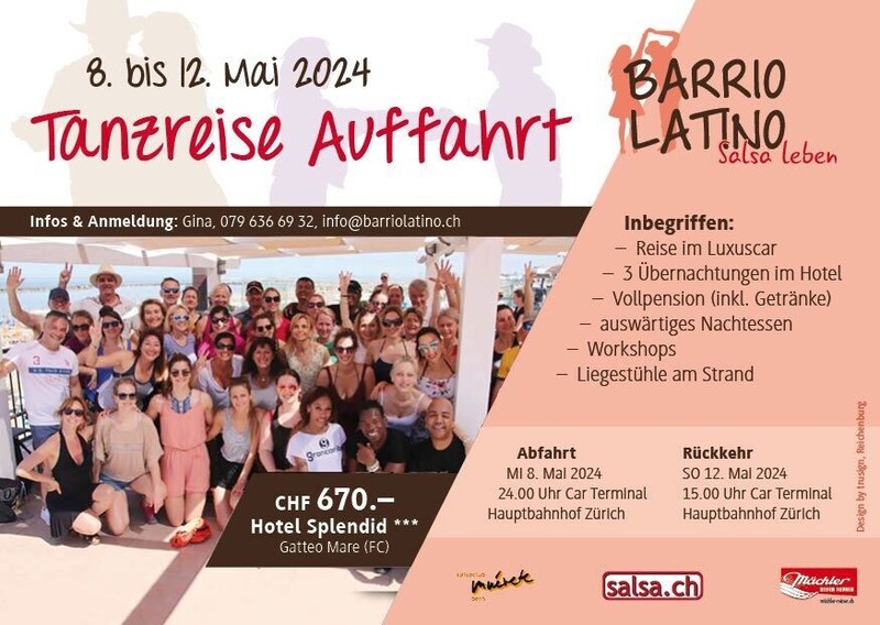 8. Mai bis 12. Mai 2024 Tanzreise Auffahrt Gatteo Mare – FC (Adria Küste) Imbegriffen: Transfer im Luxuscar + Hotel Splendid***Gatteo Mare (FC) 3 Übernachtungen, Vollpension (inkl. Getränke), auswärtiges Nachtessen, Workshops, Liegestühl am Strand. Abfahrt Mitt. 08 Mai 2024 24.00 Uhr Car Terminal-Hauptbahnhof Zürich Rückkert So 12. Mai 2024 15.00 Uhr Car Terminal-Hauptbahnhof Zürich CHF 670.- Barriolatino übernimmt keine Haftung bei Unfall. Versicherung gegen Unfall, Krankheit und Reiseversicherung ist in jedem fall Sache des Teilnehmers Email: info@barriolatino.ch Mobil: 079 6366932