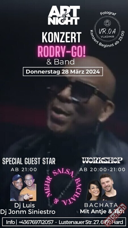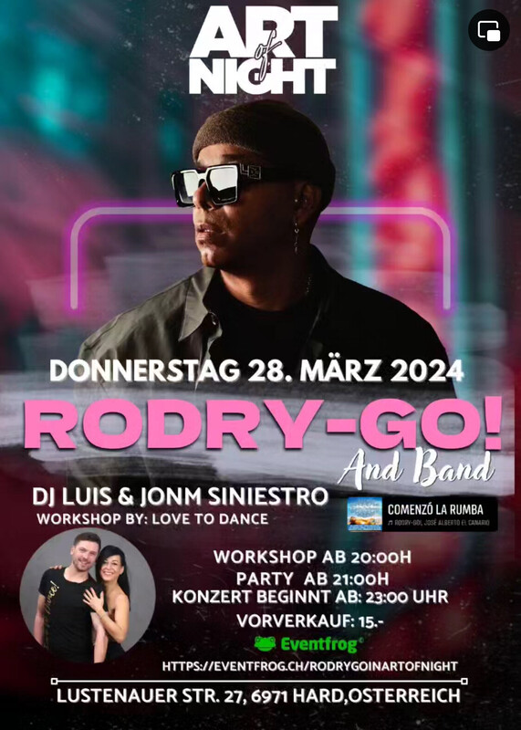 Latín Live präsentiert: RODRY-GO & BAND Am Donnestag 28. März`24 in Art of Night erleben Sie den Kolombianer Künstler live in eine unvergessliche Nacht volle Bachata, Salsa und Mehr in ART OF NIGHT. Dj Luis und Jonm Siniestro legen die besten Latin Musik wärend Party auf. RODRY-GO! Eine musikalische Kreuzfahrt in der Karibik, von Descarga Latina bis Reggaelove. Rodry-Go!, auch bekannt als Rodrigo Rodriguez Puerta, ist die kolumbianische (Cartagena) Seele von Mercadonegro, dem wichtigsten internationalen Salsa-Orchester von der Schweiz. Workshop ab 20:00H Party ab 21:00H Konzert ab 23:00H Reservation: +43 6606474194 https://www.eventfrog.ch/RodryGoinArtofNight
